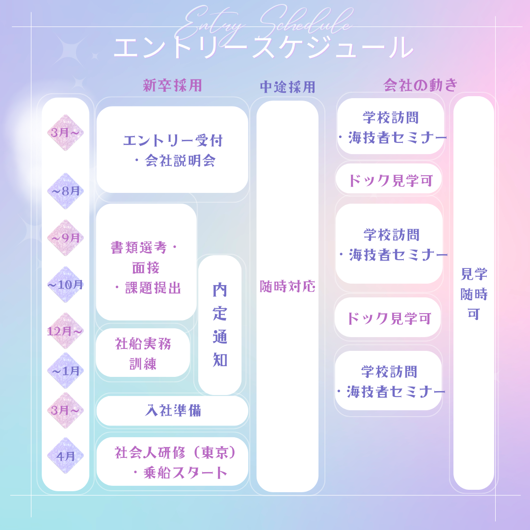 このページでは、エントリーから採用、乗船開始までの流れと目安スケジュールをご案内します。あなたの一歩を、しっかりサポートします。